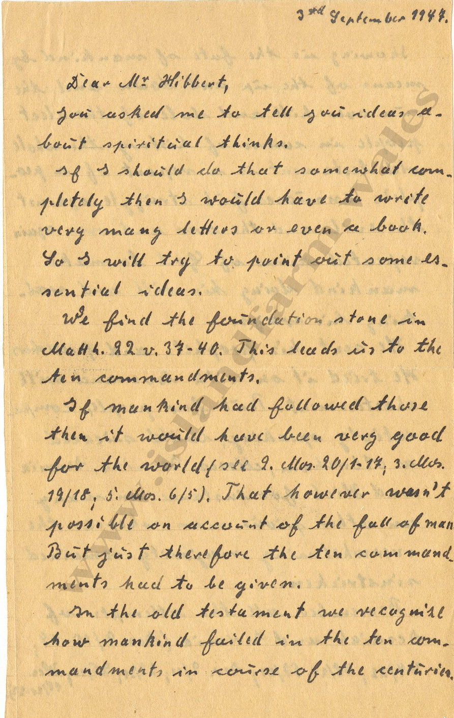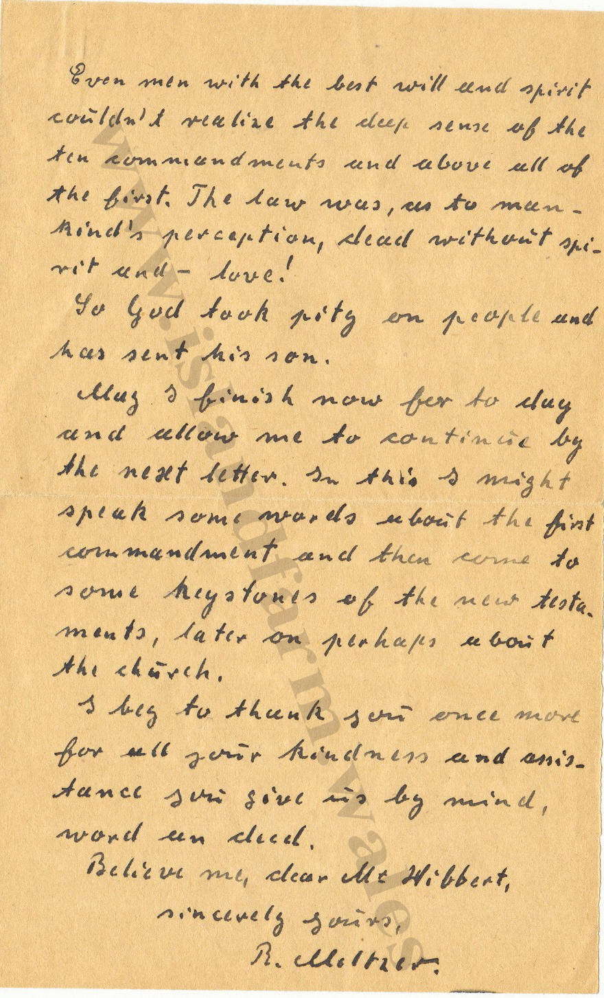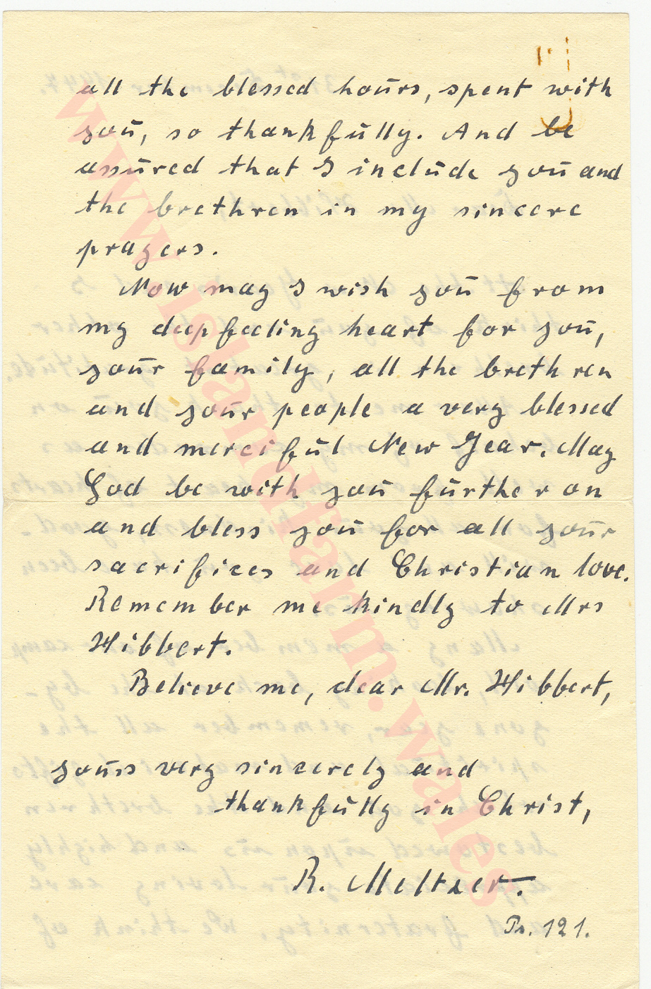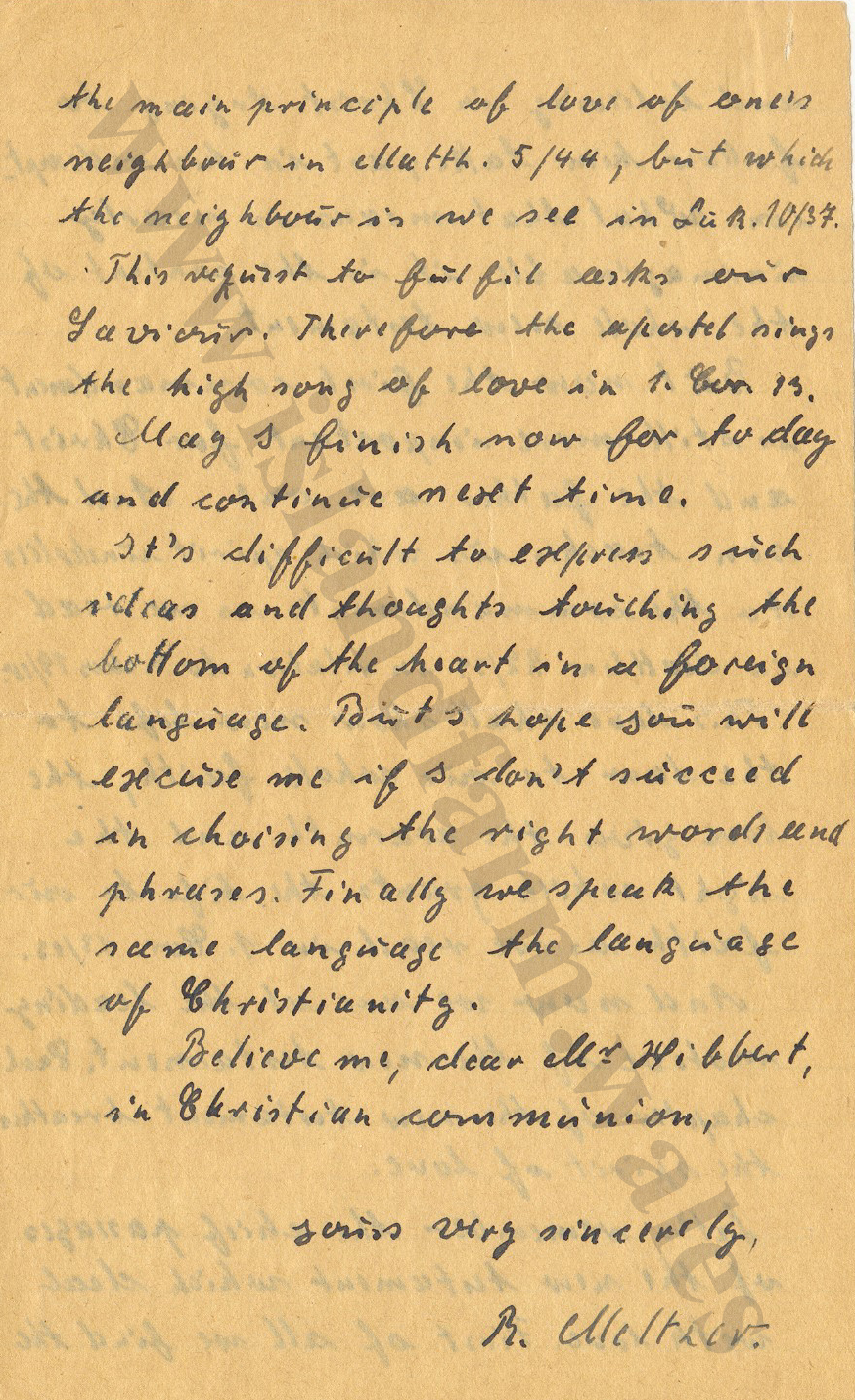 once more of our great pleasure to see you With kindest regards and in Christian communion, believe me, dear Mr Hibbert. Very sincerely Yoours R Meltzer April 12th 1947 |