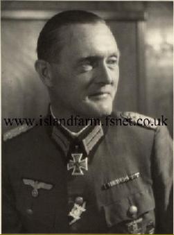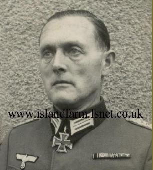 Note that Schönfeld is wearing his Knight’s Cross of the Iron Cross reversed to display the date “1813” (institution of the original Iron Cross series of decorations). Following the surrender of Germany, the Allies required all German prisoners of war to remove any badge or decoration that displayed the swastika. Hence, Schönfeld has simply reversed his decoration to conceal the offending symbol and the date “1939” found on the obverse.