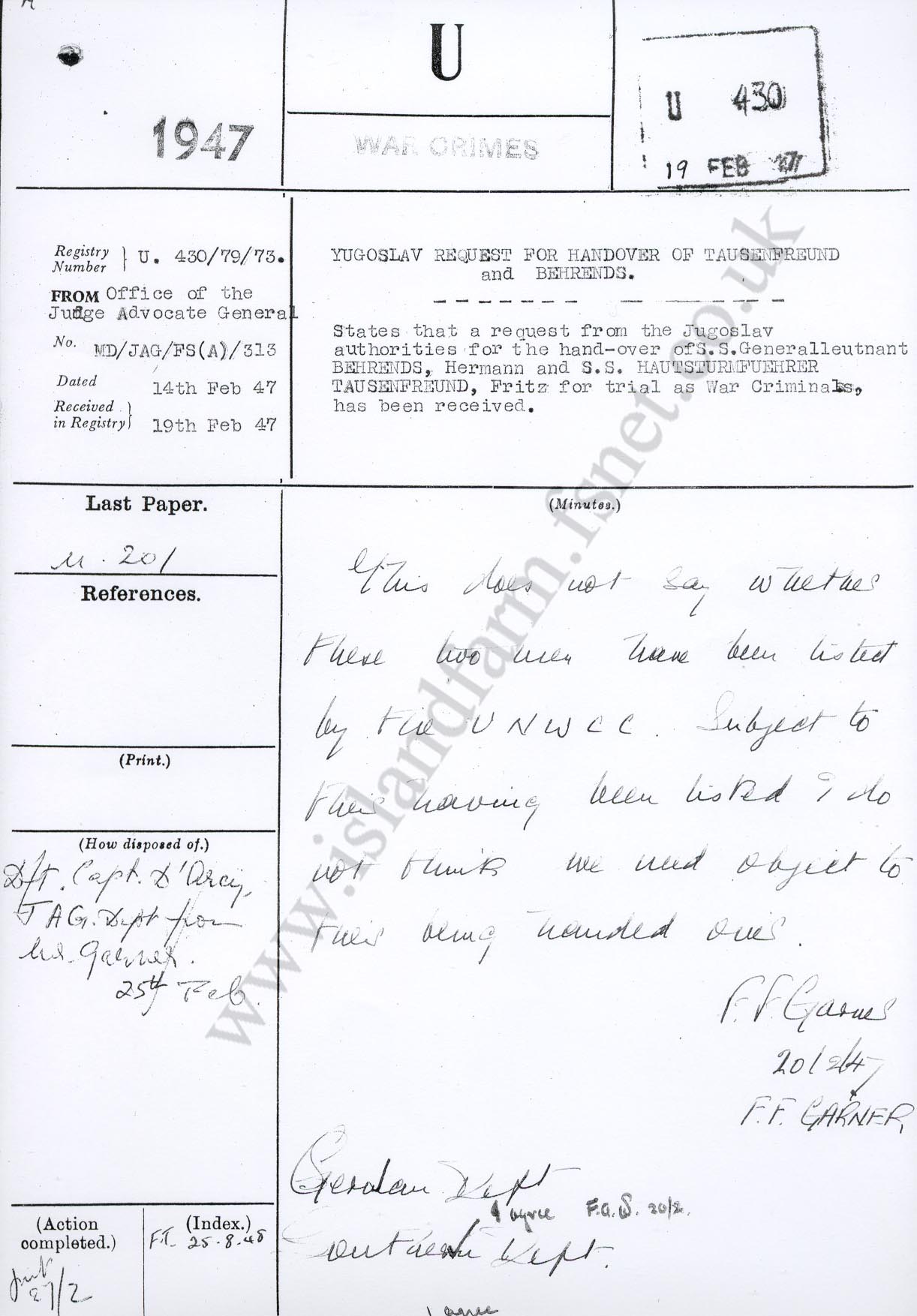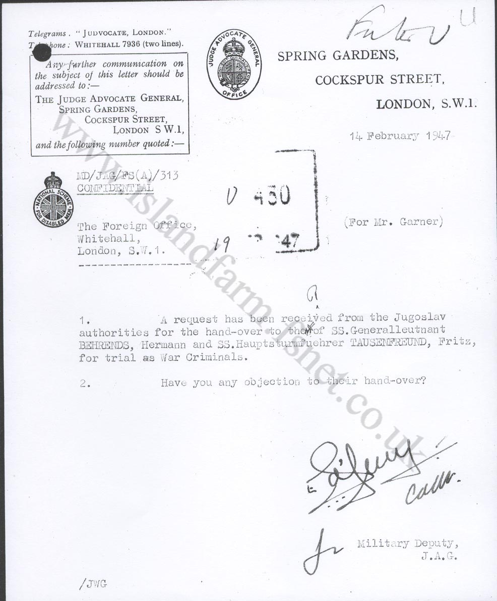 Interned at Island Farm Special Camp 11, Bridgend, South Wales until Yugoslavia requested his extradition as a war criminal in February 1947.